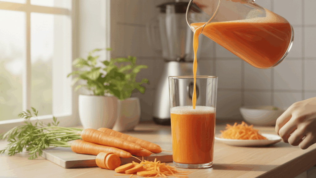 A quick health note: Carrot juice is rich in beta-carotene, which your body turns into vitamin A as needed. Drinking very large amounts daily over long periods can cause carotenemia (a harmless yellow-orange tint to the skin). Sticking to moderate portions helps avoid that.